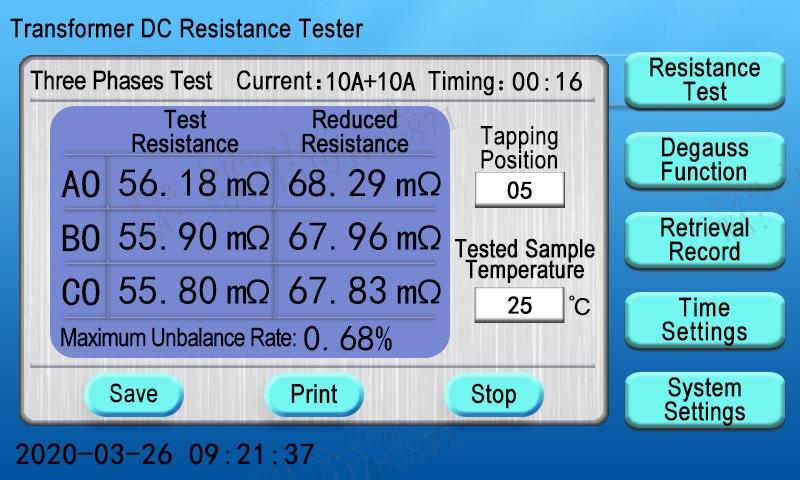 YCR9920S Winding Resistance Tester is the single and 3 phase transformer DC resistance tester with magnetic and degaussing function. It aims to measure DC resistance of inductive devices, such as transformers and power inductors. It has features of simultaneous measurement and display of three-phase resistance and three-phase unbalance rate. Fast measurement, wide range, light weight, large output current, perfect protection functions, good repeat-ability, good anti-interference ability, high accuracy, which make it an ideal equipment for measuring DC resistance of transformer winding and high inductive equipment.